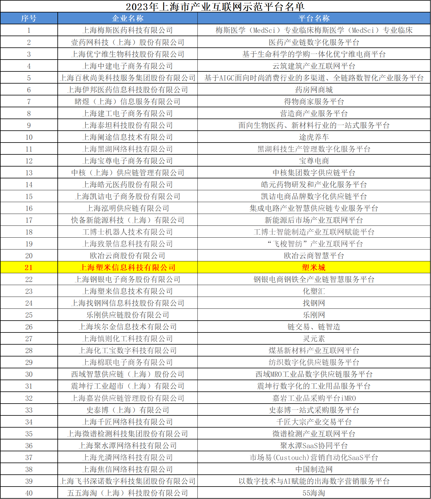 近日,由上海市經(jīng)濟(jì)和信息化委員會(huì)開展的2023年產(chǎn)業(yè)互聯(lián)網(wǎng)示范平臺遴選結(jié)果發(fā)布,經(jīng)推薦、申報(bào)、初評、專家評審等多個(gè)環(huán)節(jié),塑米城成功入選2023年上海市產(chǎn)業(yè)互聯(lián)網(wǎng)示范平臺。