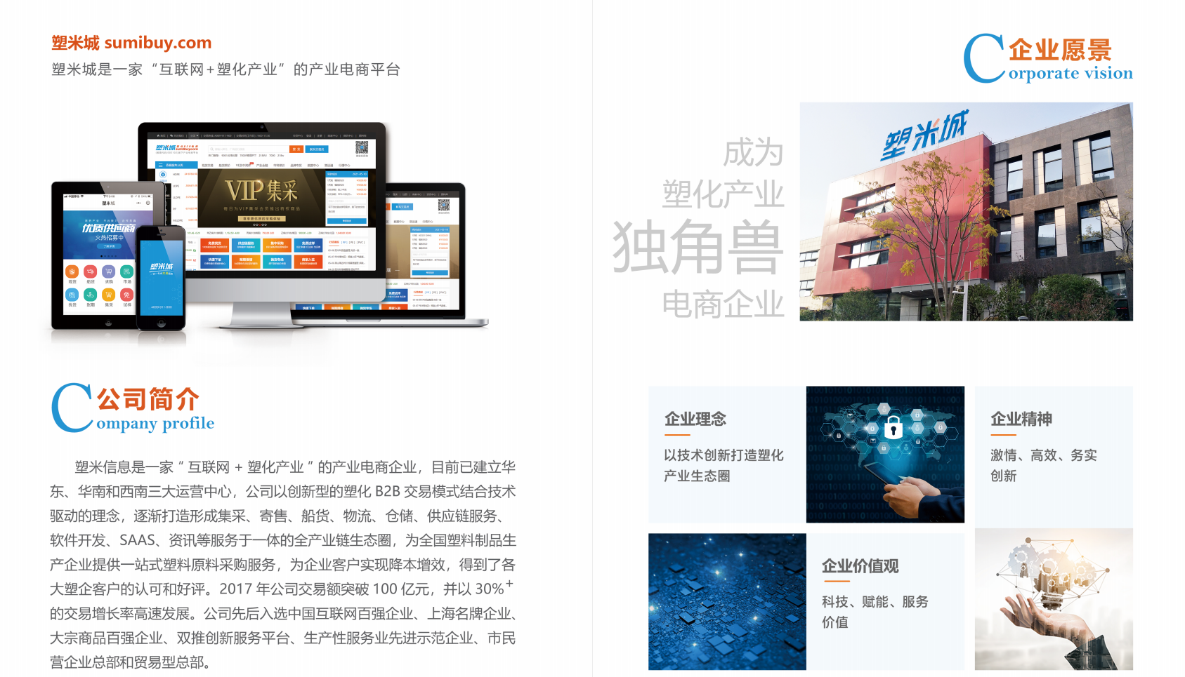 上海塑米信息科技有限公司是一家“互聯(lián)網(wǎng)+塑化產(chǎn)業(yè)”的電商企業(yè), 2014年5月成立于上海自貿(mào)區(qū),是自貿(mào)區(qū)首批核準的大宗商品電商企業(yè),目前已建立華東、華南、華中、西南四大區(qū)域運營中心,為全國22萬家中小塑料制品企業(yè)提供塑料原料采購服務(wù)。公司業(yè)務(wù)主要輻射華東﹑華南、華中、西南四大區(qū)域,后期將加大華北區(qū)域的戰(zhàn)略布局,優(yōu)化創(chuàng)新型電商平臺——塑米城,為全國塑料制品生產(chǎn)企業(yè)提供一站式塑料原料采購服務(wù)。
